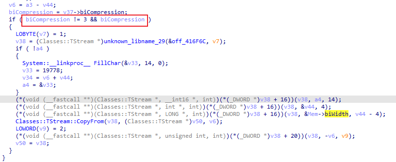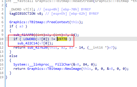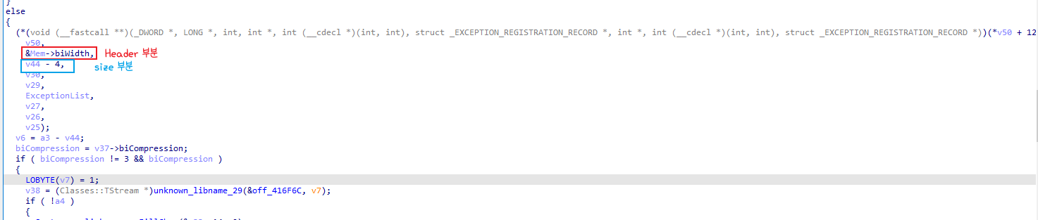 저 함수는, 우리가 임의로 수정했던 BITMAPINFOHEADER의 사이즈를 v44에 저장하는 함수입니다. 실제로 저 함수가 실행되고 난 뒤에 v44 값을 보게 되면 0x1f28로 수정되어 있는 것을 확인할 수 있었습니다.