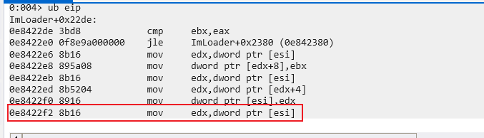 그 뒤에 ImLoader.dll의 base 주소를 구하고, 크래시가 난 함수의 시작부분에 브포를 걸고 내려가 보았는데, 이 호출이 계속 반복되다가 어느 순간 eax에 우리가 넣었던 값이 들어가있는 것을 확인했습니다.