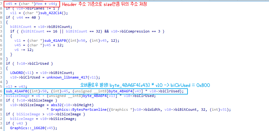 처음에는 v45에 Header 주소 기준으로 size만큼 뒤의 주소를 저장하고 분기하여 sub_41AAF0 함수로 가는데, 이 때 전달되는 값이 0x800입니다. 아까 header의 크기가 size + 0x40c였으니, 오버 플로우가 발생합니다.